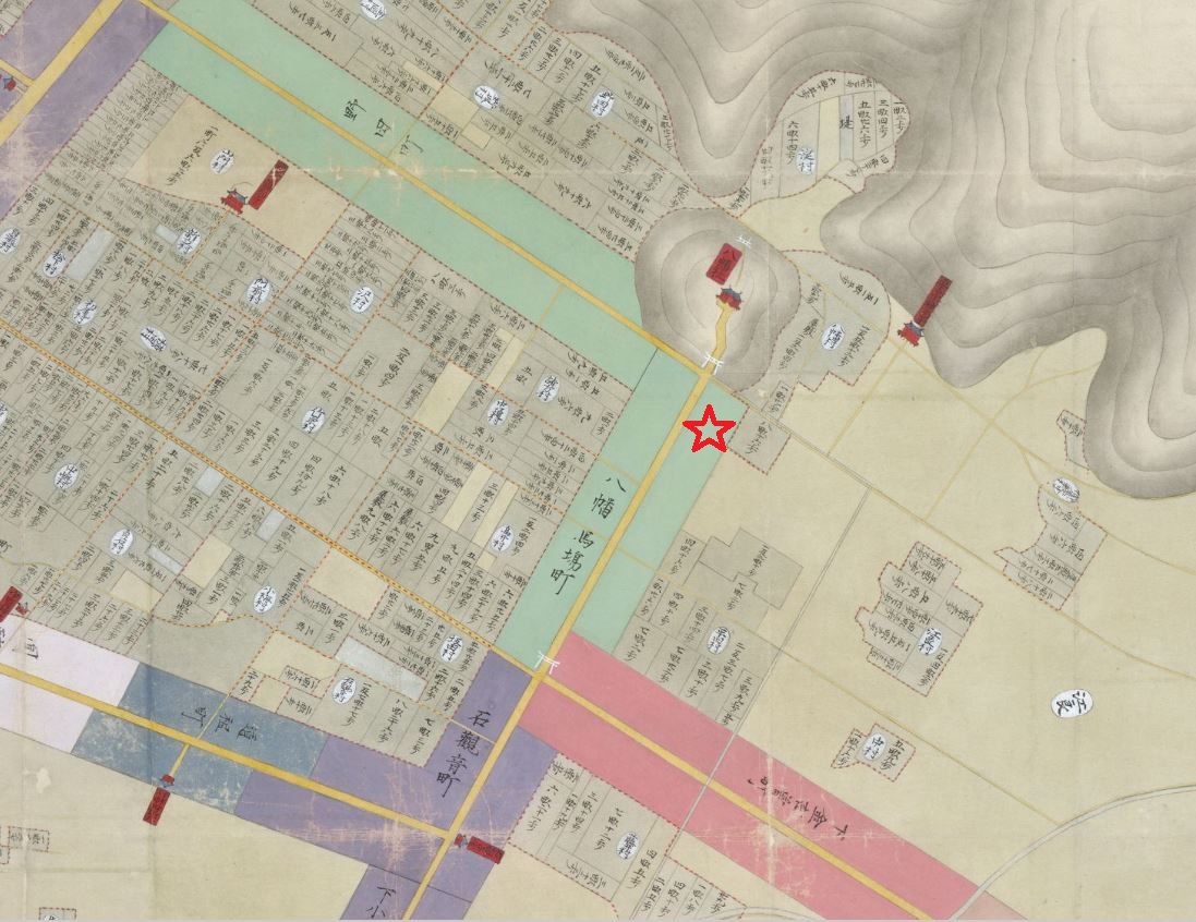 ここからは地名についての勝手な想像や推測となりますが、このあたりは“八幡馬場”と言い、古地図には、今八幡宮から降りてきた道に“八幡馬場”と記載されております。その“八幡”は、今八幡宮から由来し、“馬場”は、当時、馬は現在の車と同じようなものであるため、乗馬の練習(流鏑馬など)や馬に関する施設等が道沿いにあったのではないかと思います。これらから由来してこの辺りは、八幡馬場という地名になったのではないかと推測しております。