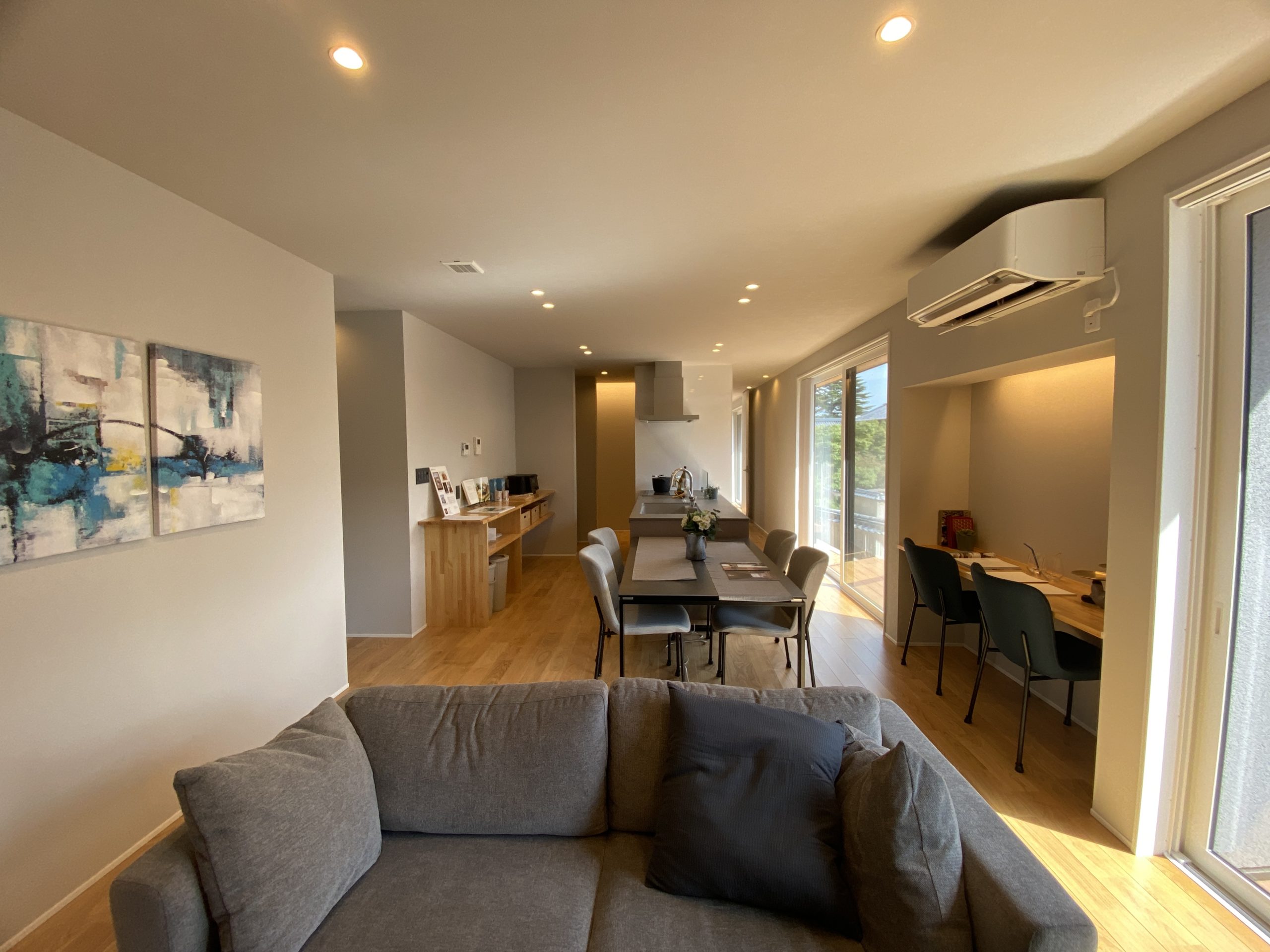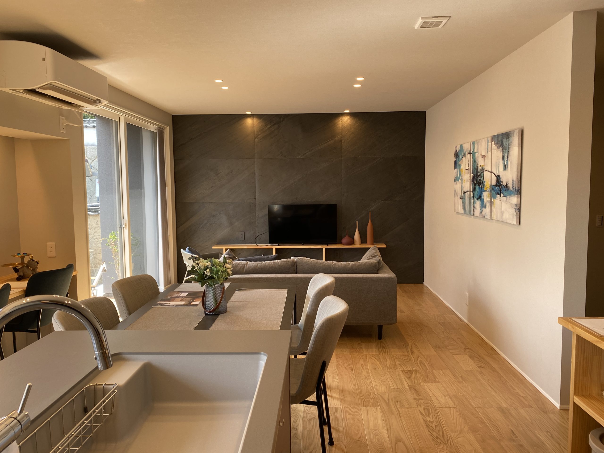 建物につきましては、玄関扉を開けると、その先のダウンライトから温かい光源が出迎え、来客があっても生活スタイルが見えないように配慮されています。おおよそ南側の開口部3面(リビング、キッチン、洋室)にデッキを設け古江小路沿いの屋外へ出ることができ、それぞれが拡張したかのように広がり、デッキへ出ると目の前には、古江小路や古江小路を代表するトラディョナルな土塀や石垣がそこにはあります。建物の南側は、リビング、ダイニング、キッチンから洋室まで(おおよそ東から西まで)一直線に直進することができるように設計されています。キッチン、南北方向に行き来できるクローゼットがおおよそコアに配置されたことによりスムーズな回遊性があり、南北に伸びる洋室は間仕切り壁を設置することにより2部屋に分けることができ、リビングの凹凸のあるブラック系の壁面は、目の前にある長府城下町を代表する長府毛利邸のイメージと調和する色調となります。
