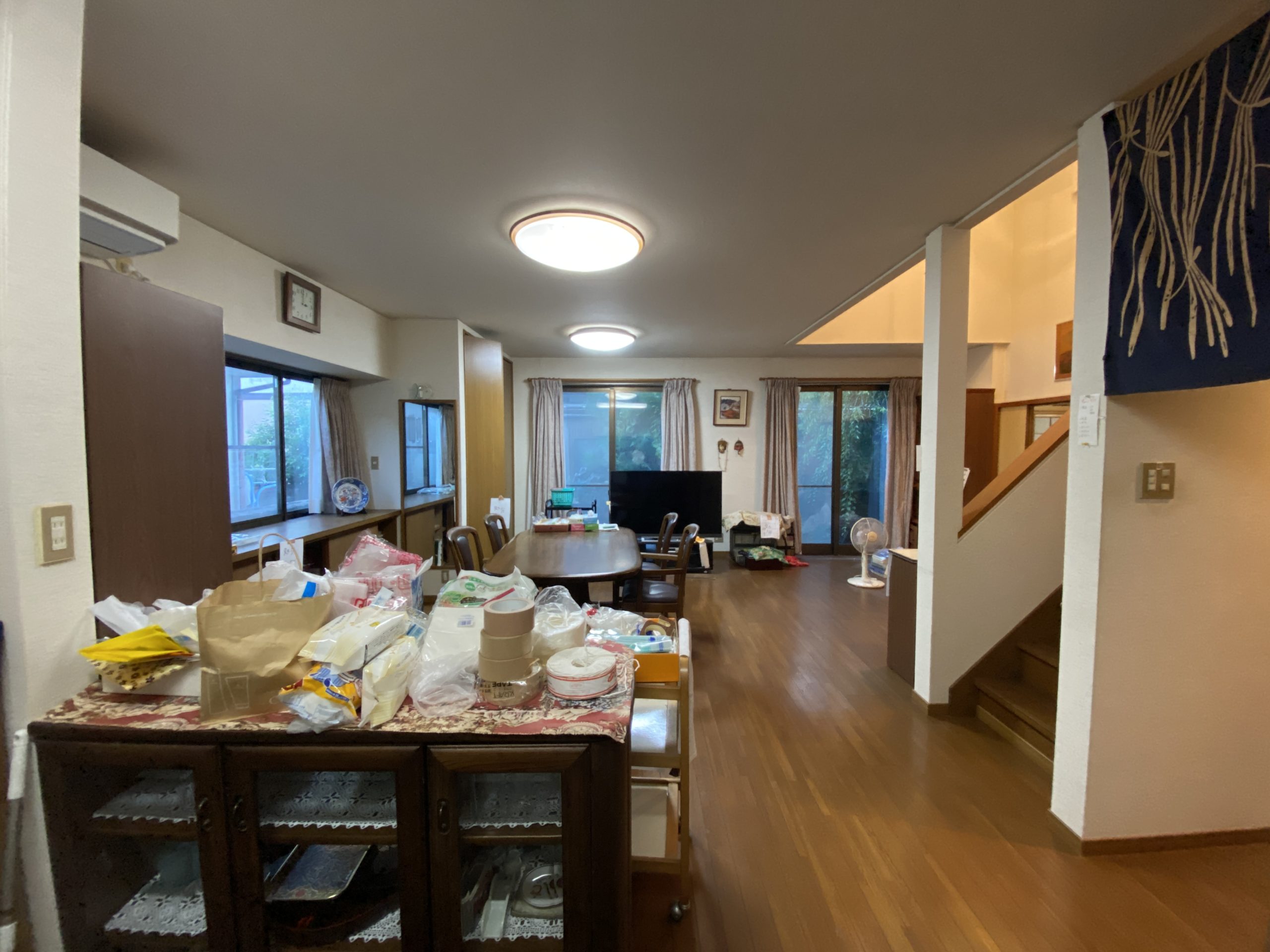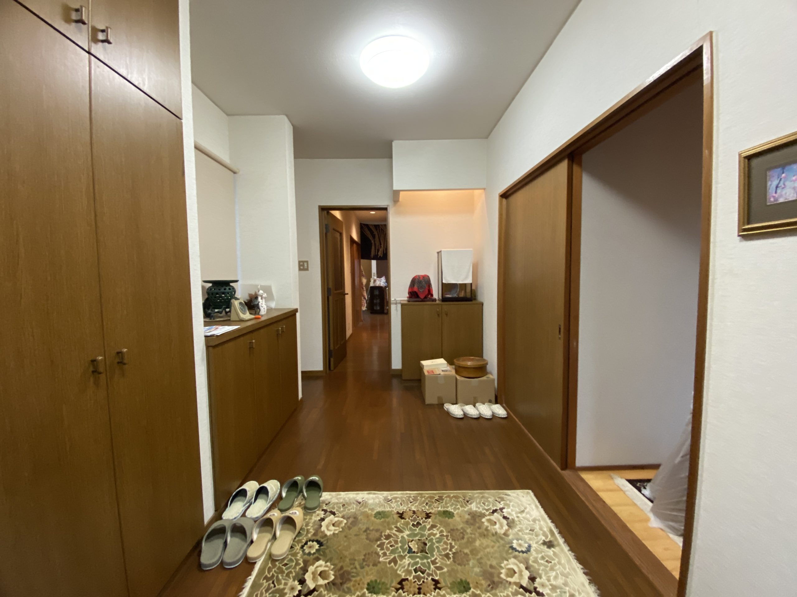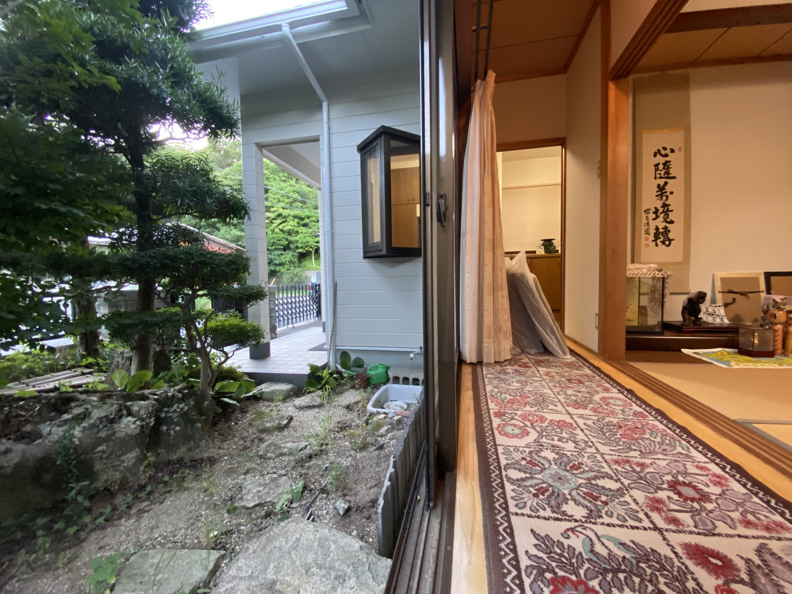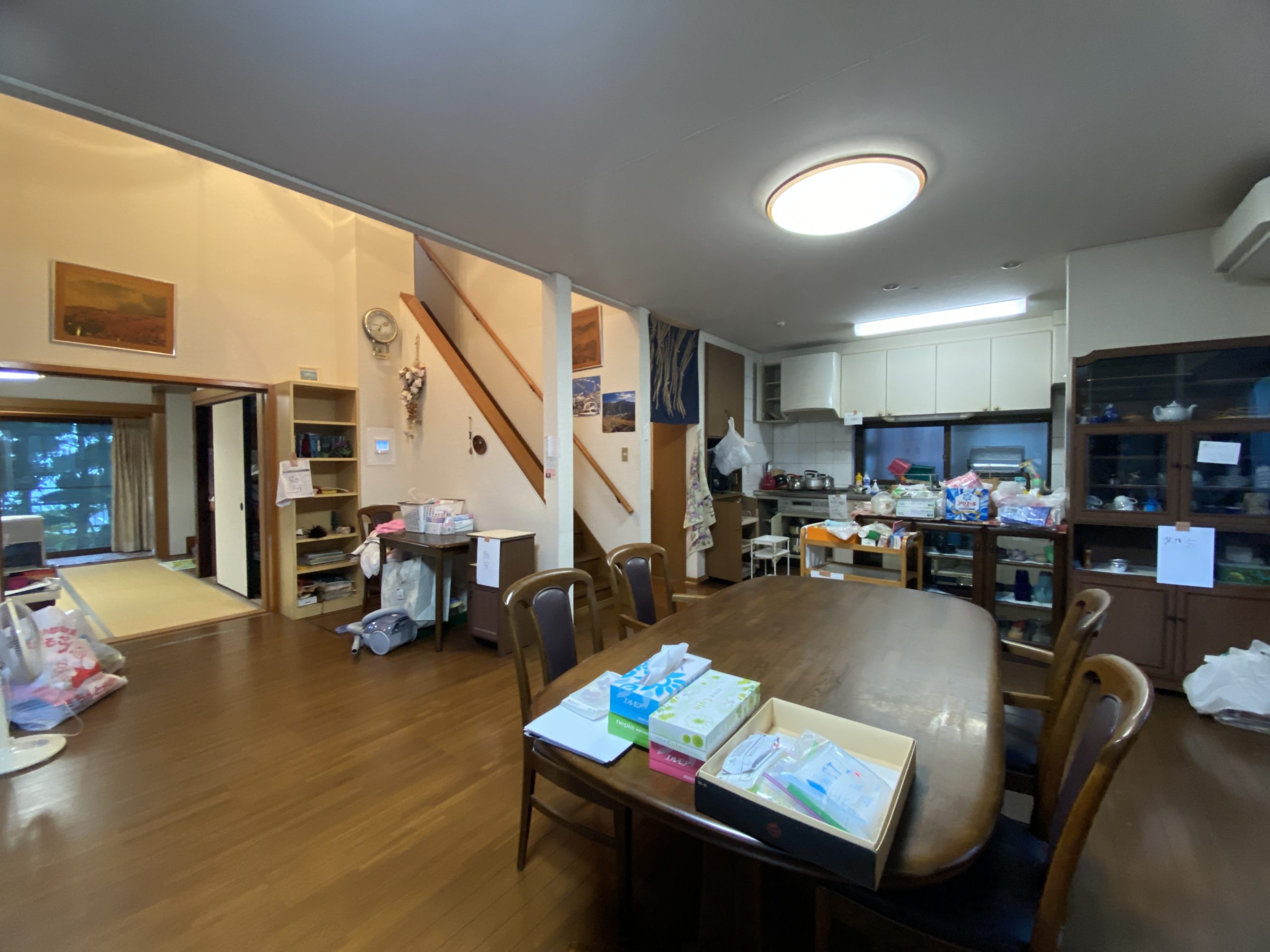 玄関へ入ると広さや照明に灯された飾り棚があり、玄関から廊下(縁側)を通り抜けると和室の客間があり、お庭の灯篭、水鉢、庭石や植栽の配置を眺めながら来客のおもてなしができそうです。建物のおおよそに中心部分に吹き抜けや階段があり、吹き抜け部分に設けられた開口部から太陽の日が差し込み、天井から吊り下げられた照明が周囲を灯し、室内を優しく包む明るい空間となりそうです。階段の上り下りをするときはLDKを通る抜ける動線となっており、建物全体として感じることは、吹抜けや階段を建物全体のコアな部分として設計し、生活スタイルの動線と来客の動線を分けたプランニングになっているような気がします。和室の客間には沓脱石(くつぬぎいし)があり、時間に余裕があるときはそこに足を下し、お庭を静かに眺めるのも良いかもしれません。